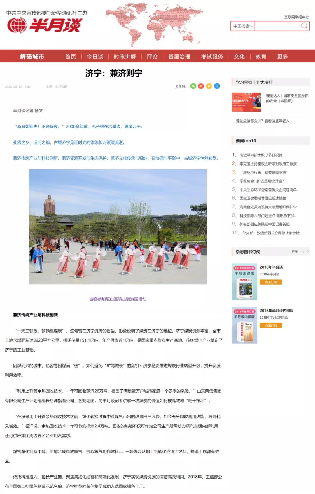 5月12日,黨刊《半月談》官網(wǎng)平臺刊載文章《濟(jì)寧:兼濟(jì)則寧》,在文章中,以第一個標(biāo)題“兼濟(jì)傳統(tǒng)產(chǎn)業(yè)與科技創(chuàng)新”,對山東榮信集團(tuán)節(jié)能降耗、綠色循環(huán)發(fā)展和大力發(fā)展氫能源,依托科技投入,拉長產(chǎn)業(yè)鏈,聚焦集約化經(jīng)營和高端化發(fā)展,從而實(shí)現(xiàn)煤炭資源清潔高效利用的成功做法和榮信集團(tuán)成功入選國家綠色工廠給予點(diǎn)贊!把榮信集團(tuán)作為資源型城市轉(zhuǎn)型升級和新舊動能轉(zhuǎn)換的典范企業(yè)加以報道!