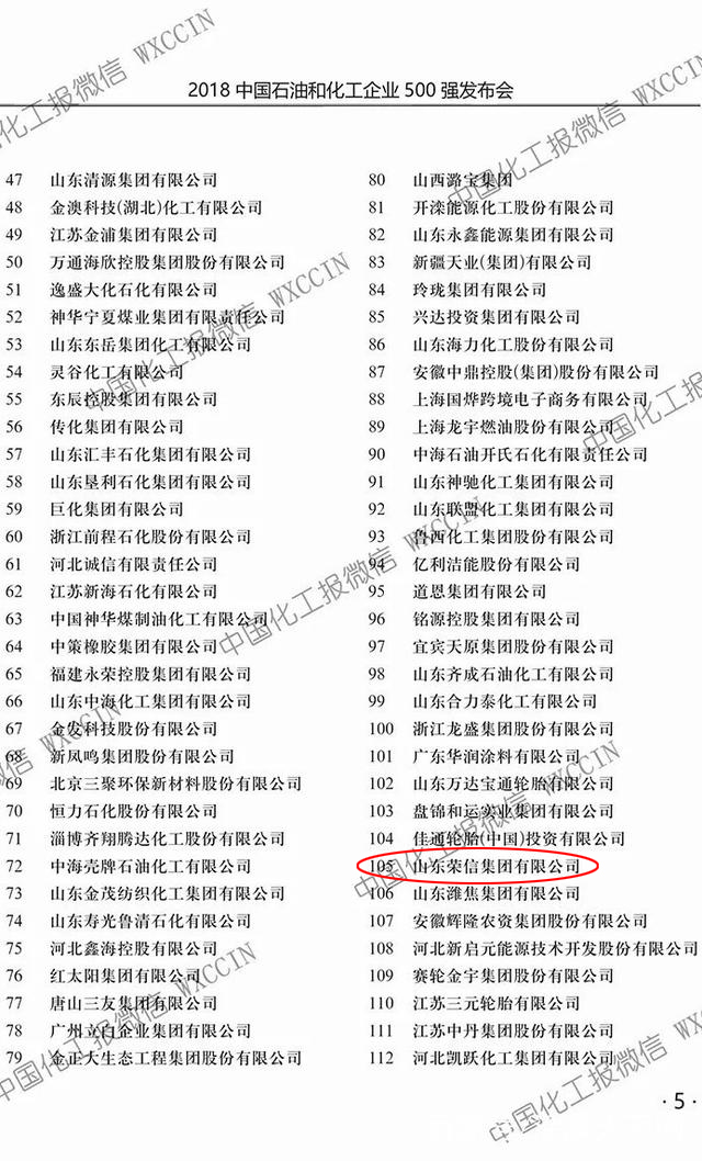 8月22日,由中國石油和化學工業(yè)聯(lián)合會和中國化工企業(yè)管理協(xié)會主辦的“2018中國石油和化工企業(yè)500強發(fā)布會暨創(chuàng)新與引領(lǐng)——中國石油和化工大企業(yè)高峰論壇”在上海召開。石油和化學工業(yè)規(guī)劃院、北京化工大學經(jīng)濟管理學院及數(shù)百家企業(yè)和機構(gòu)的代表共計400余人與會,共同見證了賦有“中國石油和化工福布斯榜”之稱的“中國石油和化工企業(yè)500強排行榜”的揭曉。其中山東榮信集團有限公司強勢上榜,排名第105位。