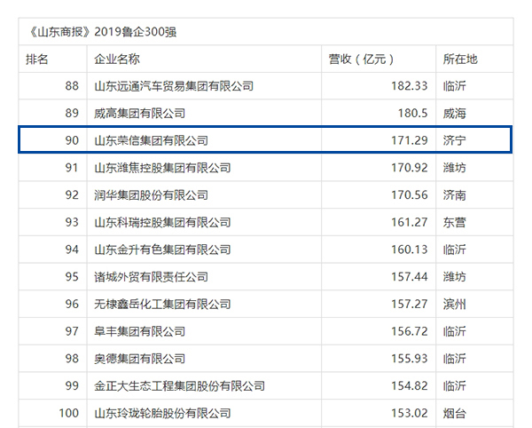 10月29日,“2019魯企300強(qiáng)”榜單發(fā)布,山東榮信集團(tuán)以171.29 億的營業(yè)收入位列榜單第90位。